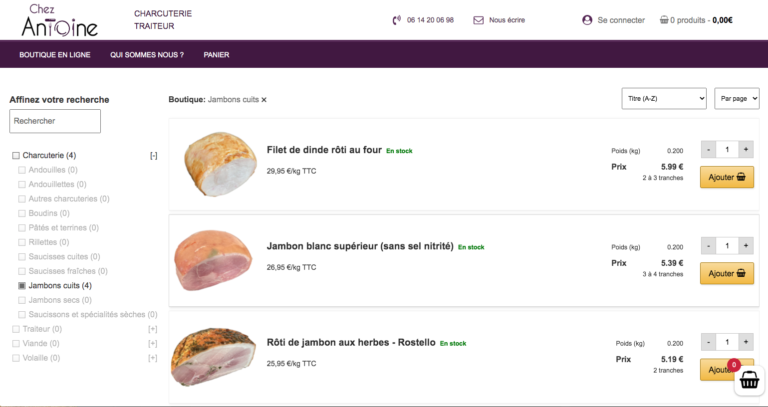 « Chez Antoine » est Charcutier-Traiteur sur les marchés de la région Parisienne. La création d’un site de présentation et e-commerce complet